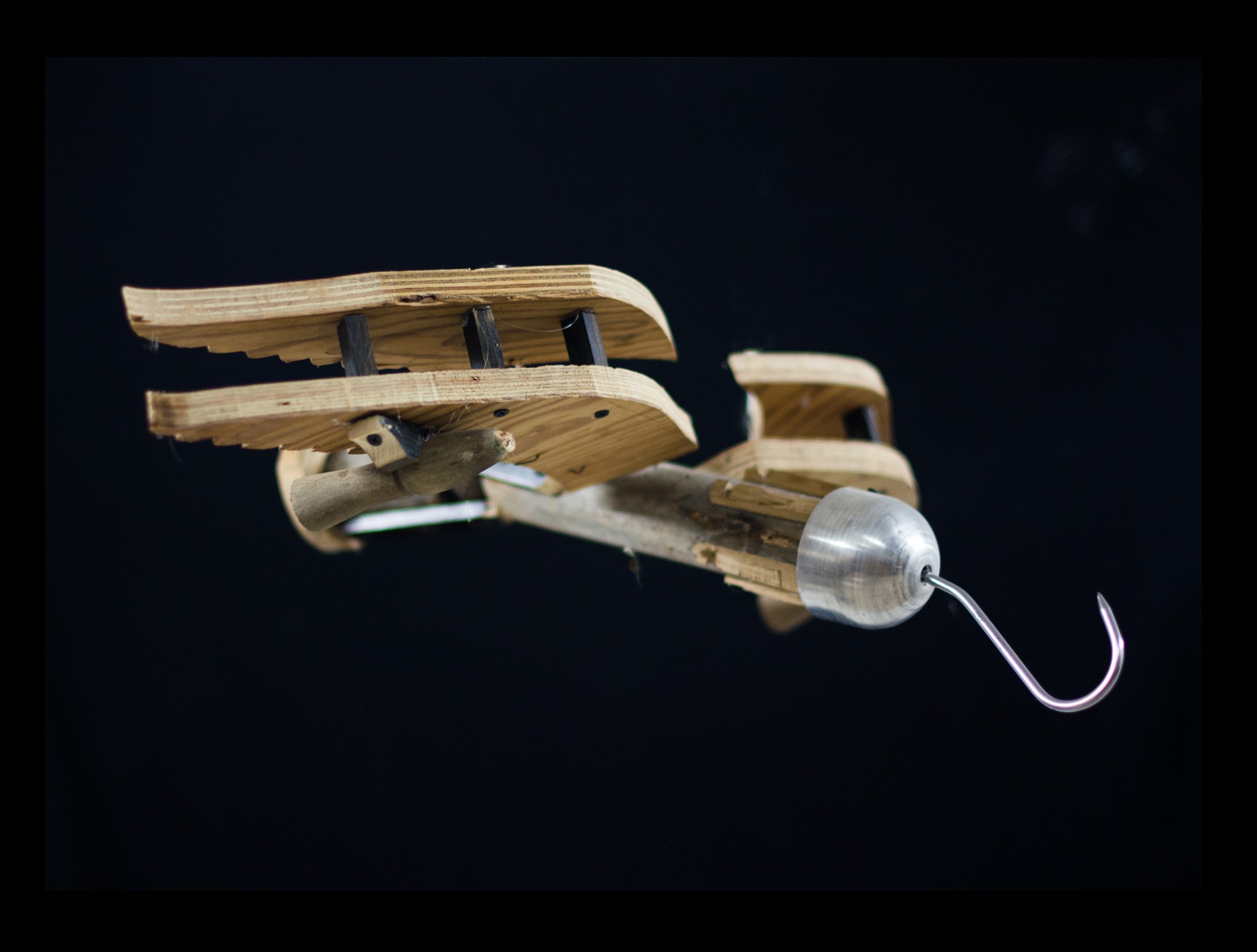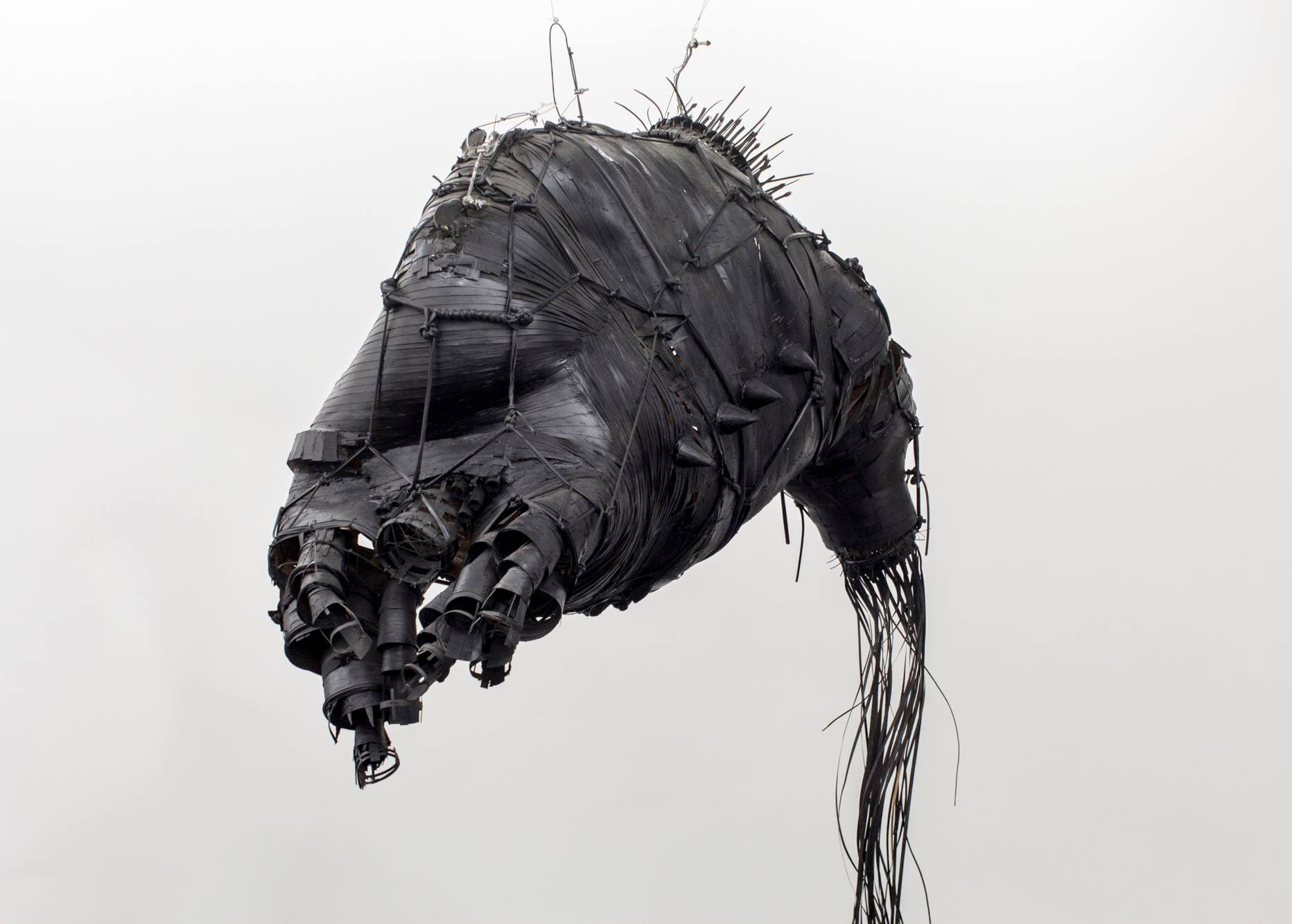 מצאתי בפח של בית מלאכה ליד הסטודיו כמות אינסופית של רצועות עץ דקות ארוכות, כמו פורניר. לקחתי לסטודיו והתחלתי להתעסק איתן. מחפש את הטכניקה. התחלתי לחבר רצועות עם שדכן סיכות באופן ספירלי כמו חוליות חימר. וכך התחילה לגדול צורה אורגנית, תלת מימדית מהרצפה. כשהצורה הייתה גדולה מספיק שהתקשתי להמשיכה, תליתי אותה מהתקרה והמשכתי אותה מהצד השני באופן מאוזן . הייתי מאוד מושפע אז מקולנוע וחשבתי לעצמי, מה הטעם לעשות אמנות עם בקולנוע מייצרים כאלו דברים פנטסטים שנראים מדהים, איך אוכל להתחרות בסרט הנוסע השמיני, הרי אני רק בן אדם אחד עם שדכן סיכות, אבל ניסיתי… הצורה גדלה וגדלה והפכה יצורית יותר ויותר. כל חלק שנעשה הוביל לחלק הבא. גוף מאסיבי של בהמה שמנה מרחף באוויר כאופנוע חסר משקל מתחת למים או בחלל. מורכב מחוליות חוליות כשריון של פרוק רגליים. חלקו האחורי של היצור כבטן דבורה המובילה למעין משפך תמנוני או מערבל בטון שבקצהו זרועות ארוכת של מדוזה המשתלשלות כזנב סוס אל הרצפה וסורקות את פניי הקרקעית. חלקו הקדמי של היצור בעל גיבנת ענקית וכתפיים רחבות כשחקן פוטבול. מתוך הכתפיים בוקעות החוצה עשרה צינורות כתומים כתעלות גישה חלליות המובילות אל פנים גוף החללית או מסילות של מכונת פינבול. במרכז, בין הכתפיים, אין ראש, אין ראש, רק עיגול של הצוואר. ניסיתי ליצור ראש, אבל לא הצלחתי, כל ראש שיצרתי גרם ליצור להראות פחות מסתורי ומשכנע ויותר בובתי. העובדה שליצור אין ראש, לא גורמת לו להראות כאילו חסר לו ראש, שראשו נערף… אלה שפשוט ככה הוא. כמו רכב, גם לאוטו אין ראש, והוא שלם ומושלם כמו שהוא.